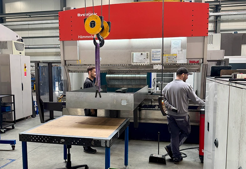 Für den Biegebereich setzen wir drei CNC-gesteuerte Maschinen ein. Die HÄMMERLE-3P – Abkantpresse der Firma BYSTRONIC mit ihrer einzigartigen Dreipunktbiegetechnologie wird für das Präzisionsbiegen, im Besonderen für Edelstähle und Aluminium, eingesetzt.