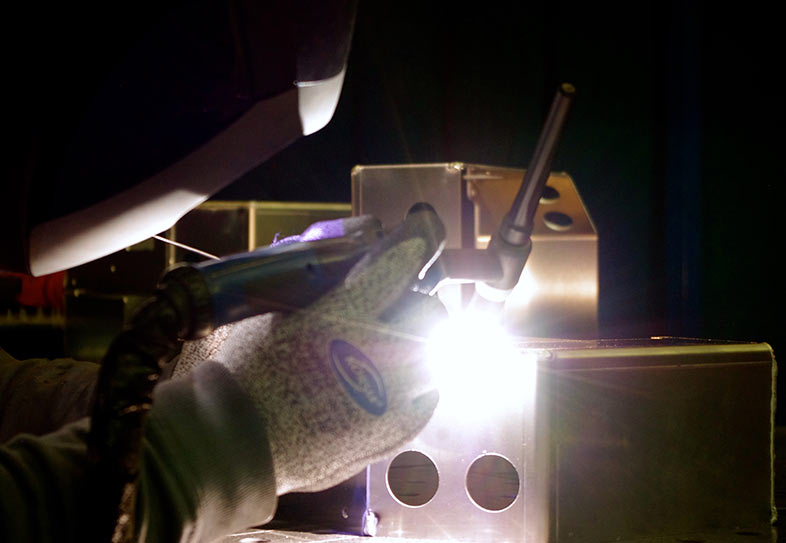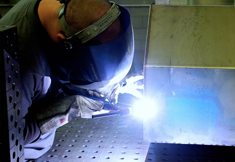 Alle Schweißarbeiten werden von einem qualifizierten Stamm- Mitarbeiterteam an professionellen 3D-Schweiß Arbeitsplätzen durchgeführt. Für das Schweißen von Stahl, Edelstahl und Aluminium werden bis zu 12 Inverter-Schweißstromquellen eingesetzt.